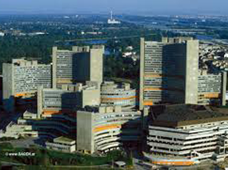Auf dem Weg zum Zentrum der Vereinten Nationen überqueren wir den Donaustrom.
